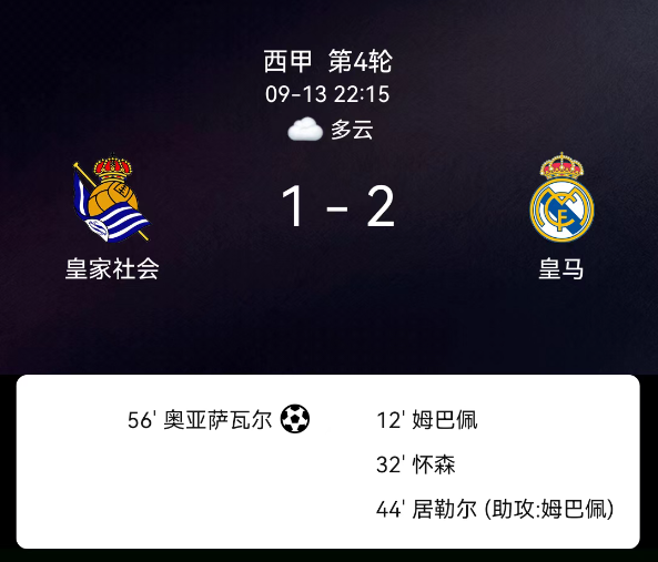北京时间9月13日22:15西甲联赛第4轮,皇家马德里客场挑战皇家社会。皇马虽上半场因红牌陷入10人作战,但凭借姆巴佩传射奠定优势,下半场顶住对手点球反扑,最终2-1险胜。